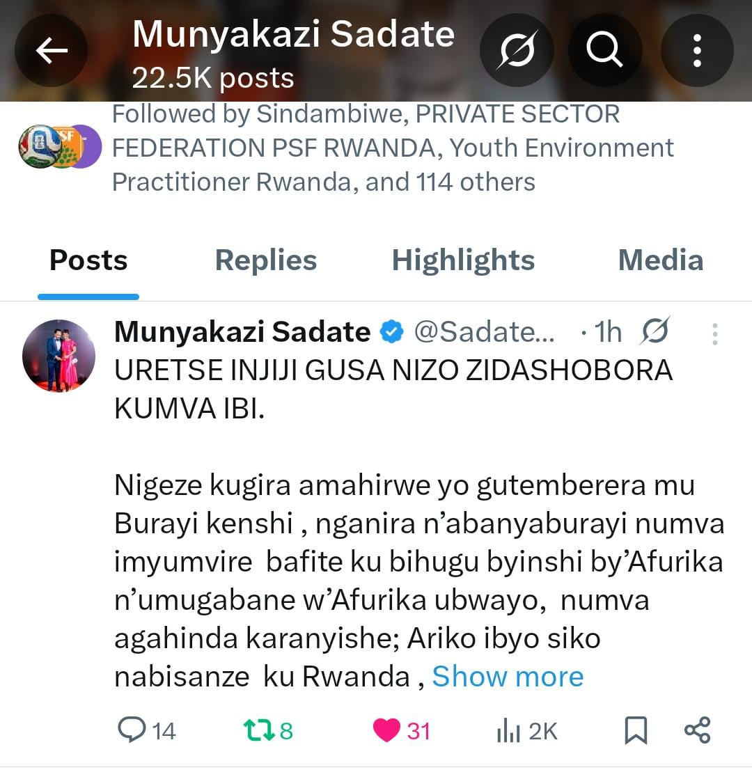 Mu butumwa yashyize ku rubuga rwa X (Twitter), Sadate yavuze ko yagiye atembera mu bihugu bitandukanye byâi Burayi, agasanga abaturage benshi bataramenya neza Afurika, batayibona nkâumugabane ugizwe nâibihugu bifite imiterere nâibikorwa bitandukanye, ahubwo bamwe bayifata nkâigihugu kimwe cyugarijwe nâamakuba. Gusa ngo iyo myumvire ihinduka iyo bigeze ku Rwanda.